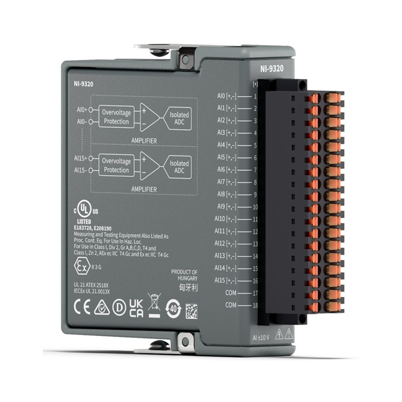 | Maximum Number of Differential Analog Input Channels: 16 Conformal Coated: No Analog Input Voltage Range: -10 V to 10 V Enclosed: Yes Analog Input Resolution: 16 bits Maximum Sample Rate: 200 kS/s/ch Analog Input Isolation: 250 Vrms Ch-Earth Ground Isolation Maximum Number of Single-Ended Analog Input Channels: 0 Front Connection Type: Spring Terminal Simultaneous Sampling: Yes Supported Hardware Platform: C Series |